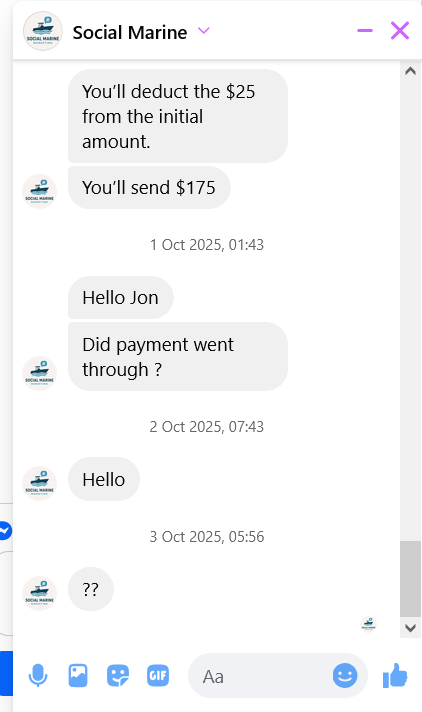 If you get a message or interact with Social Marine. Its a scam. Dont fall for it like I did!